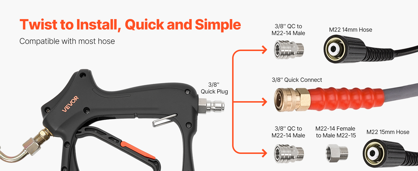 Táto predlžovacia tyč vysokotlakového čističa sa inštaluje jednoduchým otočením – bez použitia náradia. Obsahuje dva adaptéry, ktoré pasujú na mnoho hadíc vysokotlakových čističov, čo umožňuje rýchle a pohodlné nastavenie.