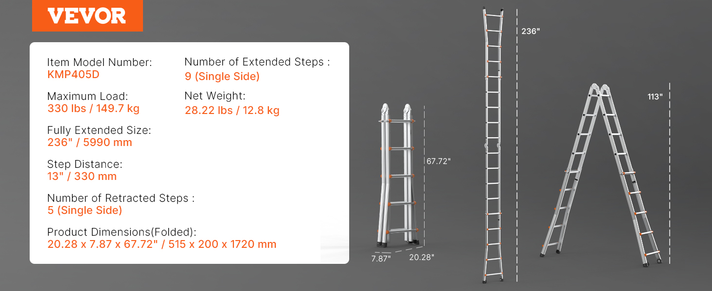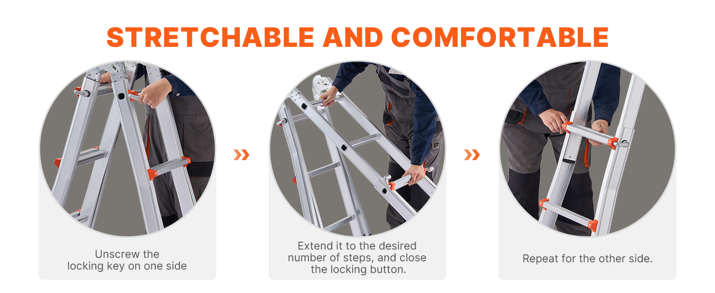 Tento všestranný výsuvný rebrík s rámom A sa dá rozšíriť a skrátiť do viacerých konfigurácií, aby spĺňal rôzne výškové požiadavky, vďaka čomu je vhodný pre rôzne scenáre. Jeho smerom von sklonené nohy poskytujú zvýšenú stabilitu a priľnavosť a nevyžadujú montáž.