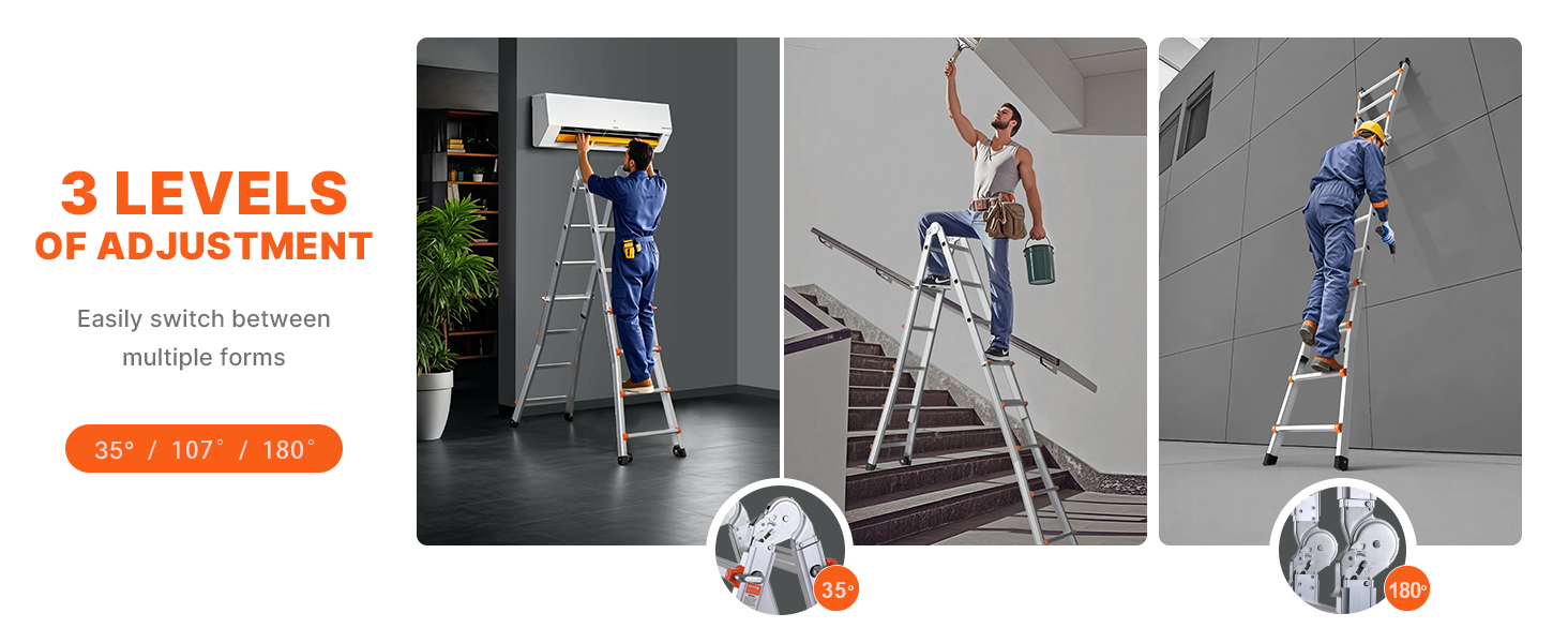 Tento multifunkčný výsuvný rebrík s rámom A má jedinečnú konštrukciu závesu, ktorá umožňuje jednoduché prepínanie medzi tromi uhlami: 35°, 107° a 180°, ktoré spĺňajú rôzne výškové požiadavky.