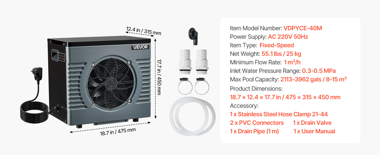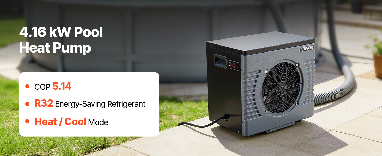 Tento nadzemný ohrievač bazénov je vybavený vysokovýkonným kompresorom, spirálovým titánovým výmenníkom tepla a odparovačom z čistej medi, vďaka čomu poskytuje viac tepla pri nižšej spotrebe elektrickej energie. V porovnaní s tradičnými ohrievačmi šetrí energiu a znižuje náklady na elektrickú energiu, pričom poskytuje čisté vykurovanie.