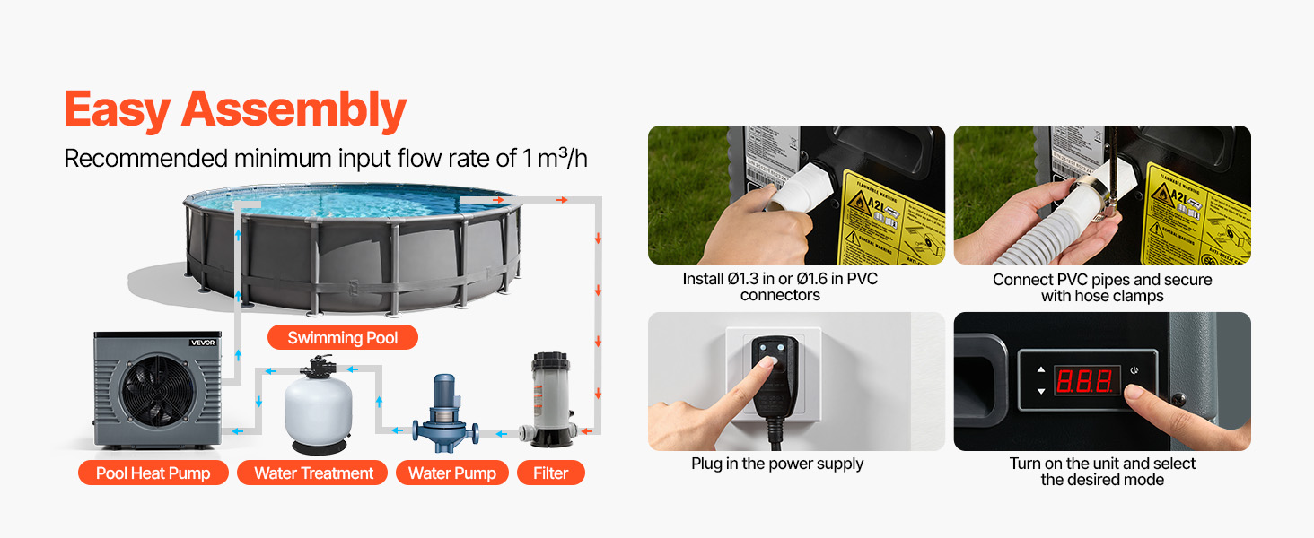 Toto tepelné čerpadlo pre bazény je navrhnuté pre jednoduchú inštaláciu a umožňuje ľahké pripojenie vstupných a výstupných portov k hadiciam bazénu. Jedna osoba ho môže rýchlo nainštalovať, čím ušetrí čas a námahu a zároveň si užije príjemné a bezpečné kúpanie.