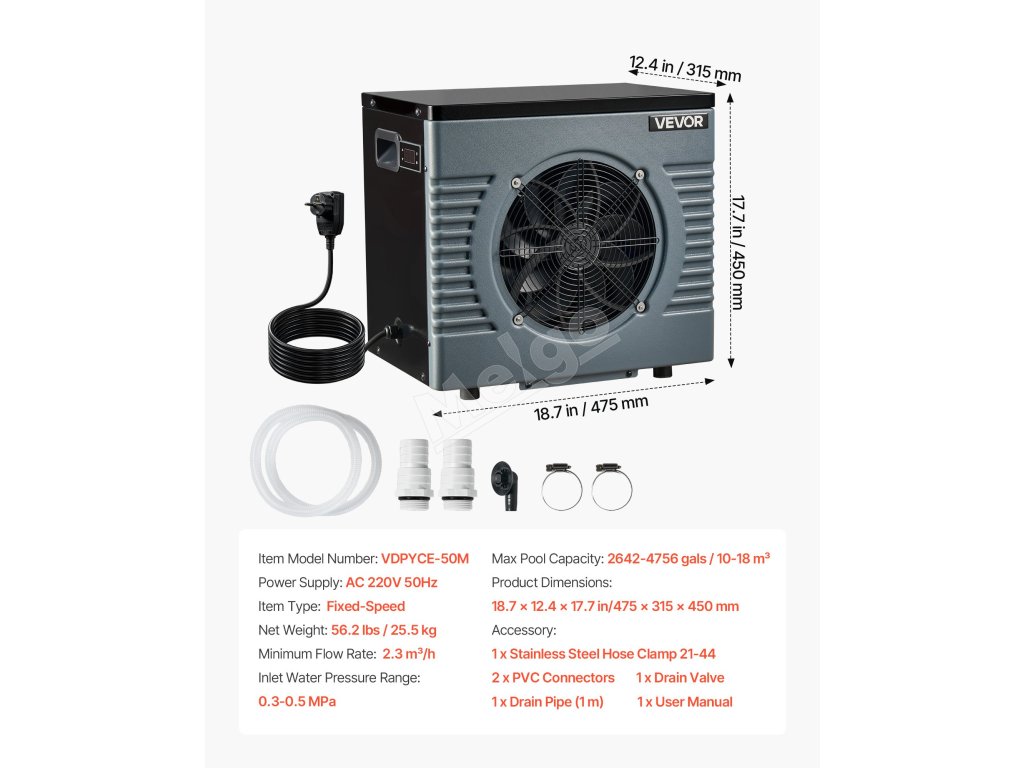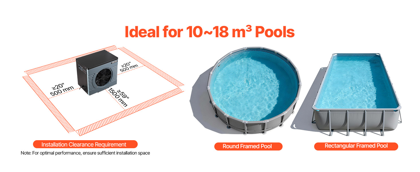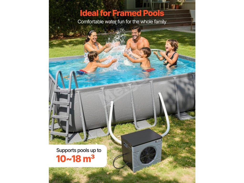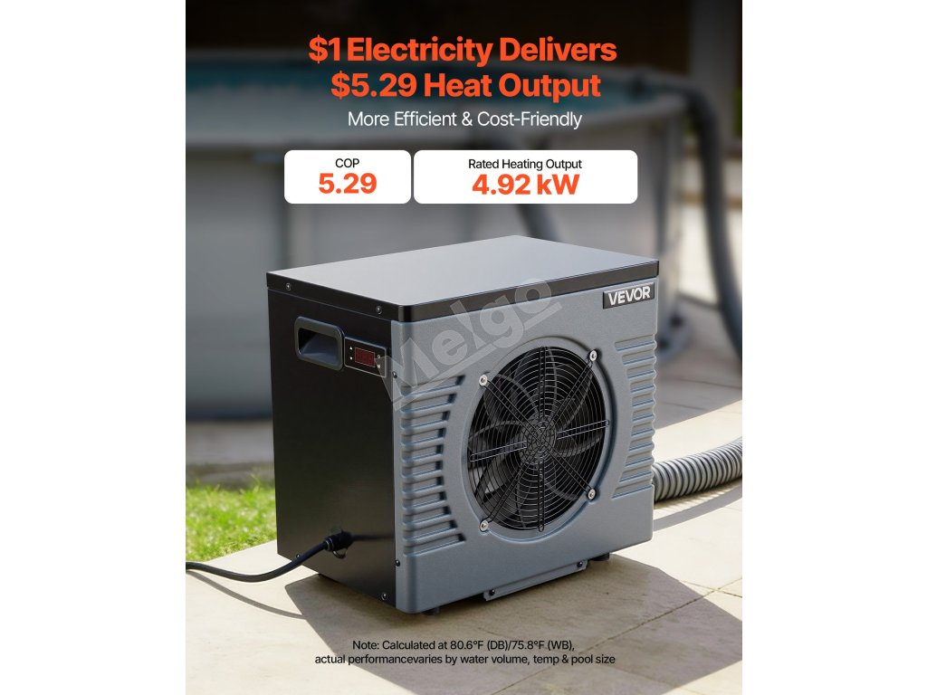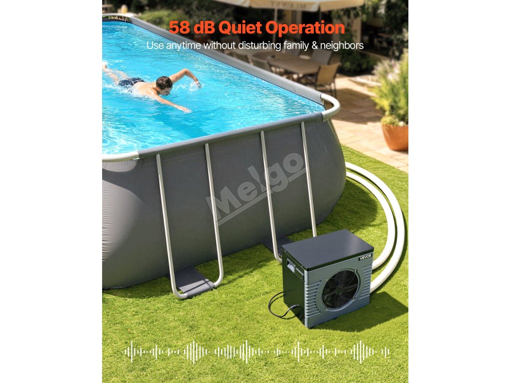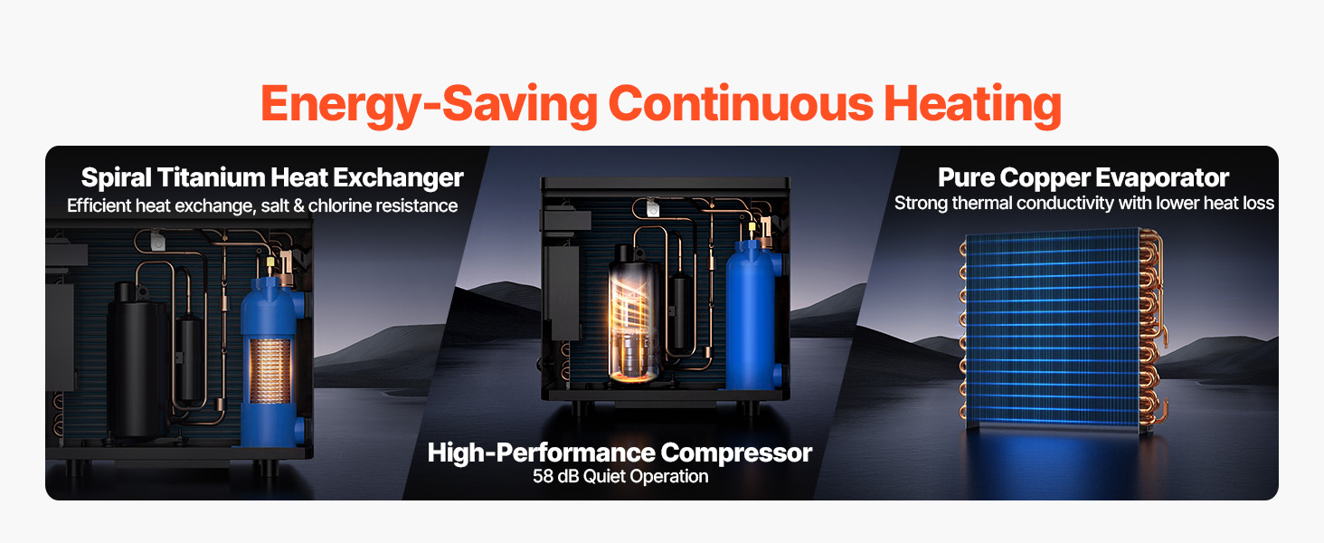 Tento nadzemný ohrievač bazénov je vybavený vysokovýkonným kompresorom, spirálovým titánovým výmenníkom tepla a odparovačom z čistej medi, vďaka čomu poskytuje viac tepla pri nižšej spotrebe elektrickej energie. V porovnaní s tradičnými ohrievačmi šetrí energiu a znižuje náklady na elektrickú energiu, pričom poskytuje čisté vykurovanie.