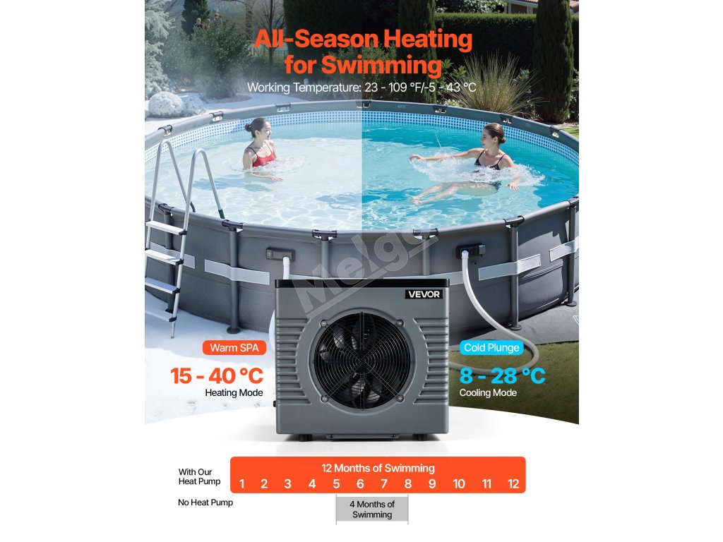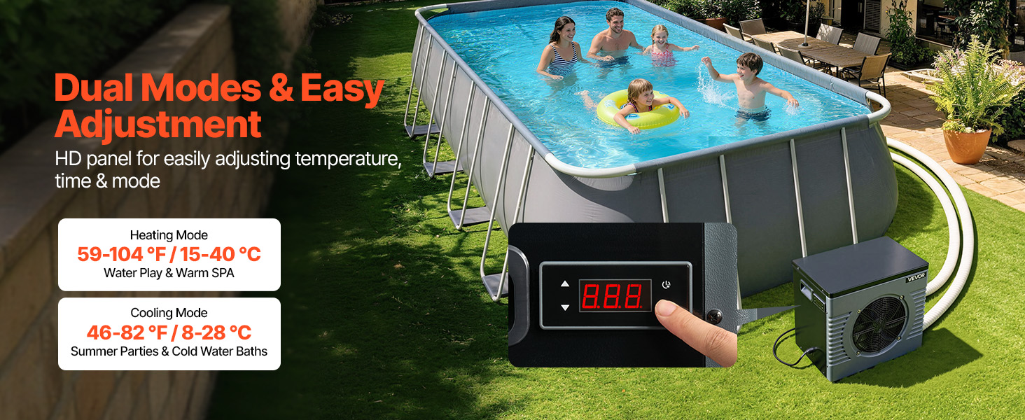 Vďaka režimom kúrenia a chladenia tento elektrický ohrievač bazénov umožňuje celoročné pohodlné kúpanie. Plávajte, cvičte alebo organizujte bazénové párty za každého počasia bez obáv o teplotu vody.
