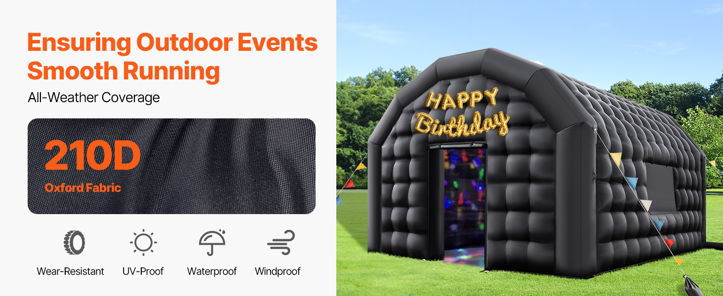 Tento nafukovací párty stan, vyrobený z tkaniny 210D Oxford, odoláva slnku, dažďu a opotrebovaniu - poskytuje spoľahlivú ochranu pri každej vonkajšej oslave.