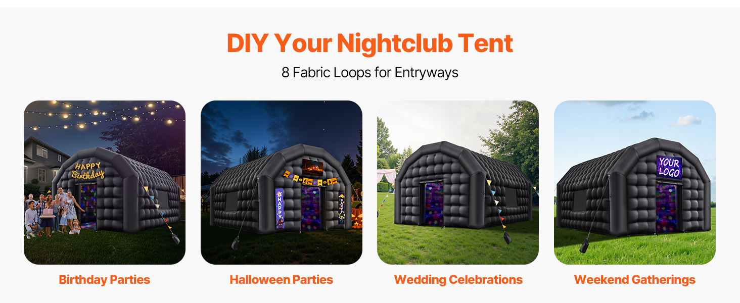 Vďaka 8 textilným pútkam na vchod môžete svoj nafukovací nočný klub vyzdobiť tak, aby sa hodil k narodeninám, svadbám, halloweenskym párty alebo víkendovým podujatiam.
