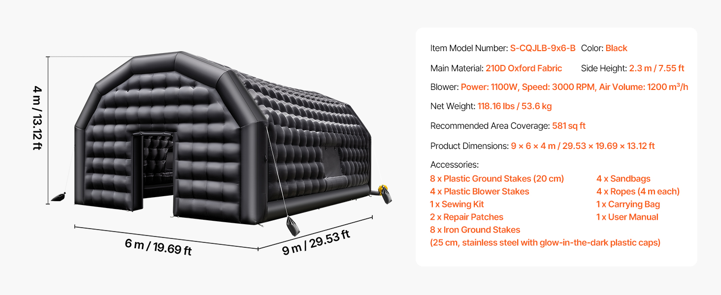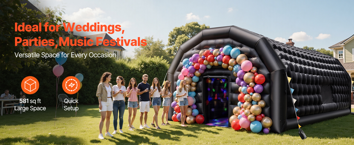 Tento nafukovací stan s rozlohou 581 m² ponúka veľký priestor na svadby, narodeniny, Halloween a epické párty. Rýchlo sa postaví a zbalí, je kompatibilný s diskotékovým osvetlením, má odolnú tkaninu Oxford a zosilnenú stabilitu, vďaka čomu sa stane vaším spoľahlivým partnerom na každej oslave.