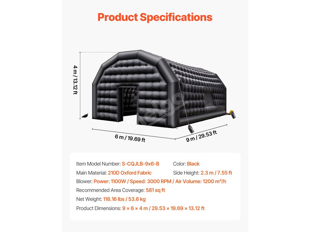 Tento nafukovací stan s rozlohou 581 m² ponúka veľký priestor na svadby, narodeniny, Halloween a epické párty. Rýchlo sa postaví a zbalí, je kompatibilný s diskotékovým osvetlením, má odolnú tkaninu Oxford a zosilnenú stabilitu, vďaka čomu sa stane vaším spoľahlivým partnerom na každej oslave.