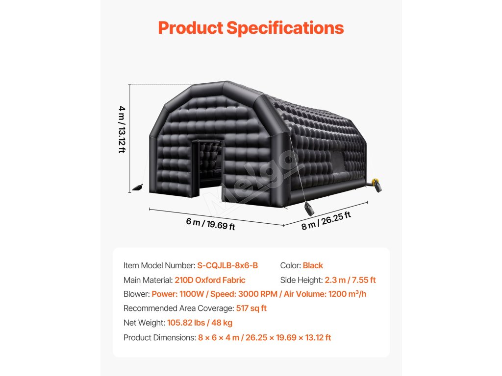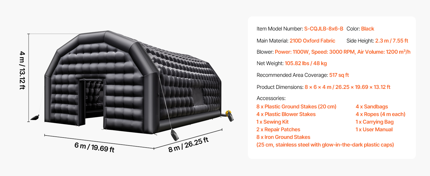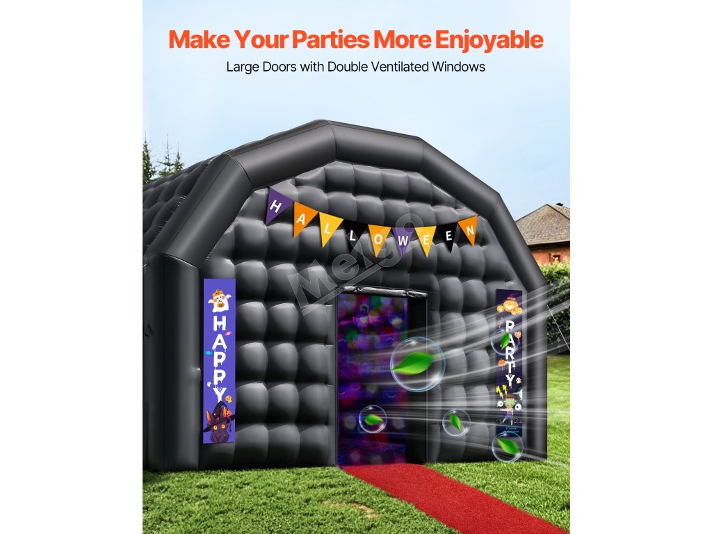 Tento nafukovací stan s rozlohou 517 m² ponúka veľký priestor na svadby, narodeniny, Halloween a epické párty. Rýchlo sa postaví a zbalí, je kompatibilný s diskotékovým osvetlením, má odolnú tkaninu Oxford a zosilnenú stabilitu, vďaka čomu sa stane vaším spoľahlivým partnerom na každej oslave.