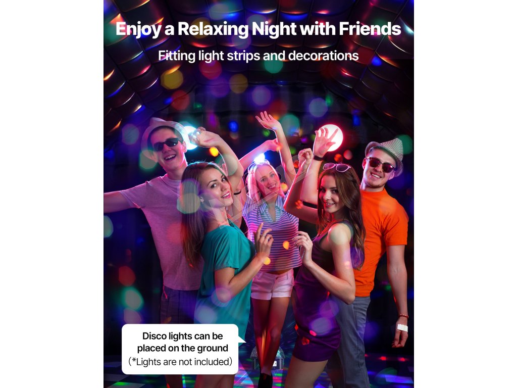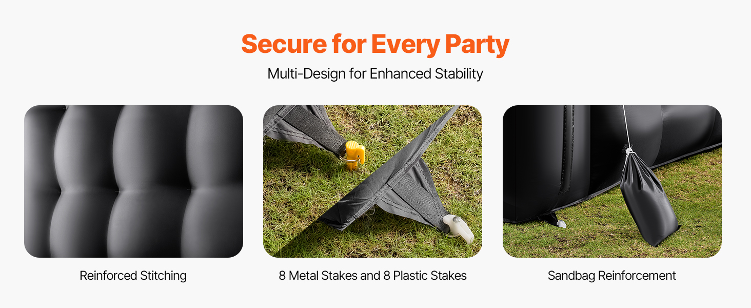 Tento nafukovací nočný klub, navrhnutý so zosilneným šitím, 8 železnými a 8 plastovými kolíkmi do zeme a vrecami s pieskom, zostáva stabilný aj vo vonkajších podmienkach.