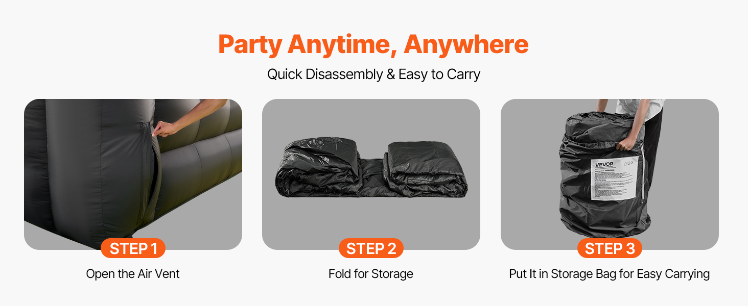 Tento nafukovací párty stan sa rýchlo vyfúkne a zloží, zmestí sa do prenosnej tašky na jednoduchú prepravu - ideálny na zostavenie a zloženie na cestách.