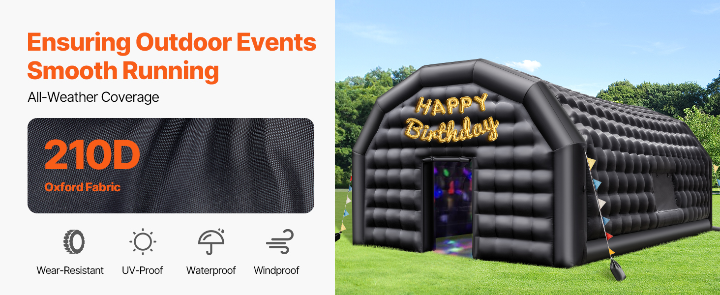 Tento nafukovací párty stan, vyrobený z tkaniny 210D Oxford, odoláva slnku, dažďu a opotrebovaniu - poskytuje spoľahlivú ochranu pri každej vonkajšej oslave.