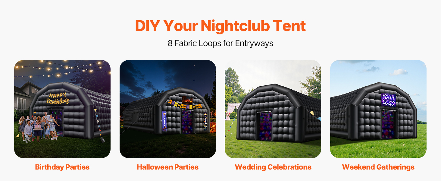 Vďaka 8 textilným pútkam na vchod môžete svoj nafukovací nočný klub ozdobiť tak, aby sa hodil k narodeninám, svadbám, halloweenskym párty alebo víkendovým podujatiam.