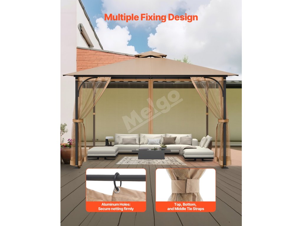 Vďaka hliníkovým upevňovacím otvorom v hornej časti je táto zástena na altánok stabilnejšia a odolnejšia ako tradičné polyesterové tkaniny. V spojení s háčikmi a krúžkami sa ľahko inštaluje a bezpečne pripevňuje k rámu altánku, čím udržiava váš vonkajší priestor uprataný a organizovaný.
