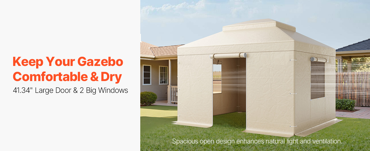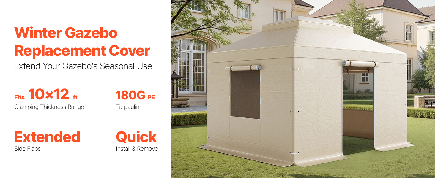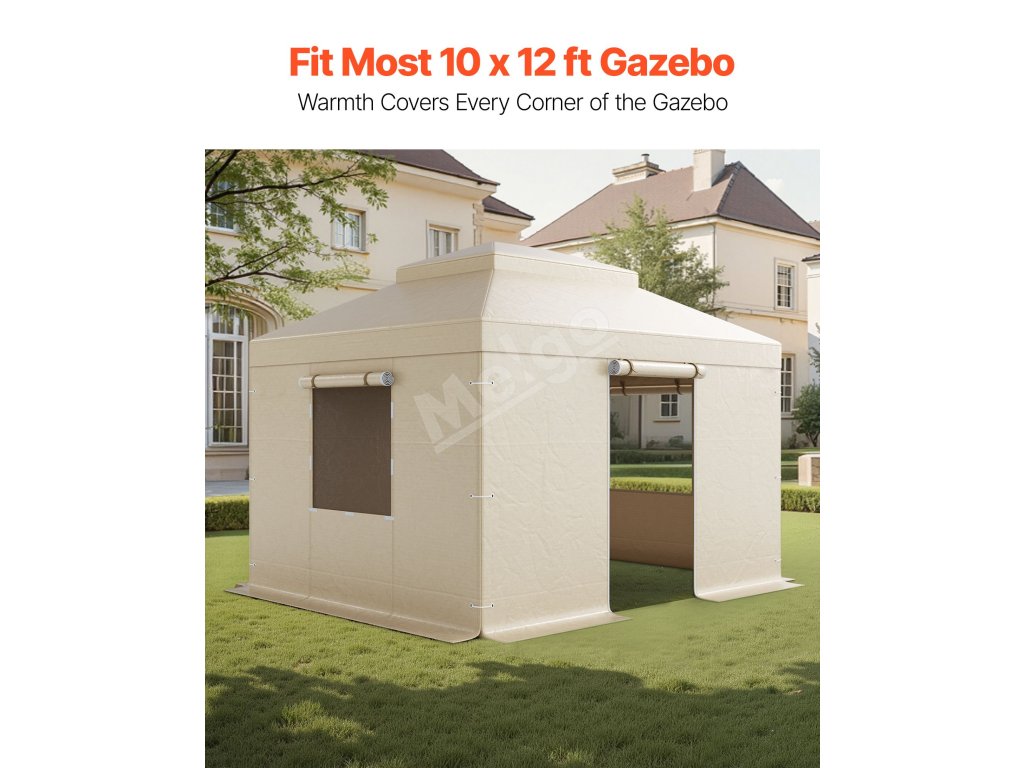 Tento univerzálny zimný kryt na altánky je vybavený 9,84 palcovou / 25 cm prízemnou lištou s kovovými priechodkami na upevnenie základne. Zosilnené viazacie popruhy sa ovíjajú okolo stĺpikov, zatiaľ čo 1,5 palcové / 3,8 cm silné háčikové a slučkové uzávery zaisťujú panely dohromady pre väčšiu odolnosť voči vetru a stabilitu.