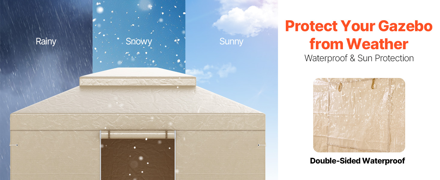 Náš kryt na vonkajší altánok s obojstrannou PE vrstvou odoláva vode, slnku a snehu. Chráni váš altánok počas slnečných, daždivých a zasnežených období bez vyblednutia alebo opotrebovania.