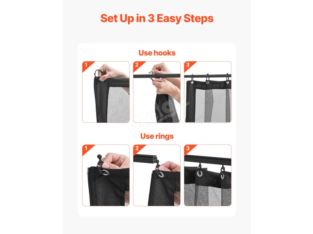 Táto sieť na altánky je vhodná pre väčšinu altánkov s rozmermi 12 × 12 × 7,5 stopy, vyrobená zo 100 % polyesteru odolného proti roztrhnutiu. Účinne blokuje muškáty a poskytuje súkromie. Je vybavená hliníkovými upevňovacími otvormi, háčikmi a krúžkami na bezpečné pripevnenie. Možno ho prať na jednoduché čistenie a skladovanie. Obojstranný zips pre väčšie pohodlie.