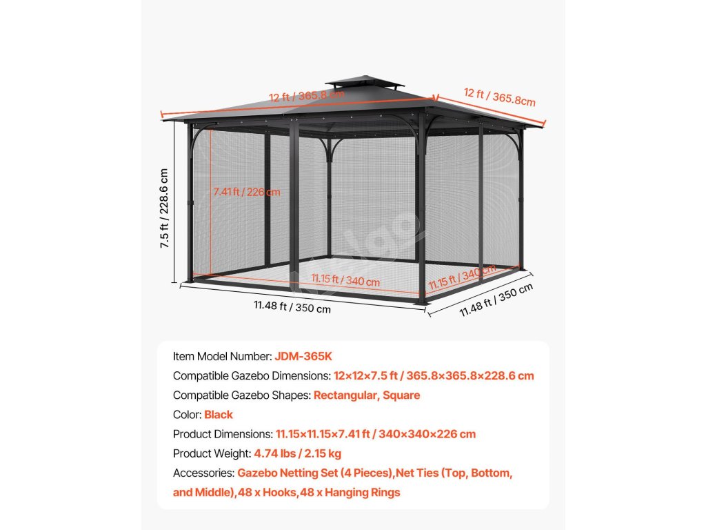 | Kompatibilné rozmery altánku | 12 × 12 × 7,5 ft / 365,8 × 365,8 × 228,6 cm |