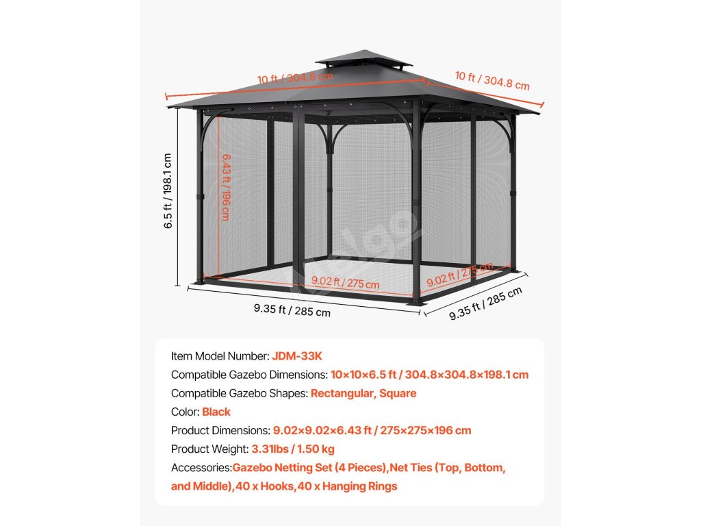 Táto sieť na altánky sa hodí na altánky s rozmermi 10 × 10 × 6,5 stôp, je vyrobená zo 100 % polyesteru odolného proti roztrhnutiu. Účinne blokuje muškáty a poskytuje súkromie. Je vybavená hliníkovými upevňovacími otvormi, háčikmi a krúžkami na bezpečné pripevnenie. Možno ho prať v práčke na jednoduché čistenie a skladovanie. Obojstranný zips pre väčšie pohodlie.