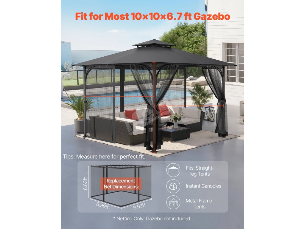 Sieťovina na altánok 10 × 10 × 6.7 FT, 4 panely, dvojitý zips