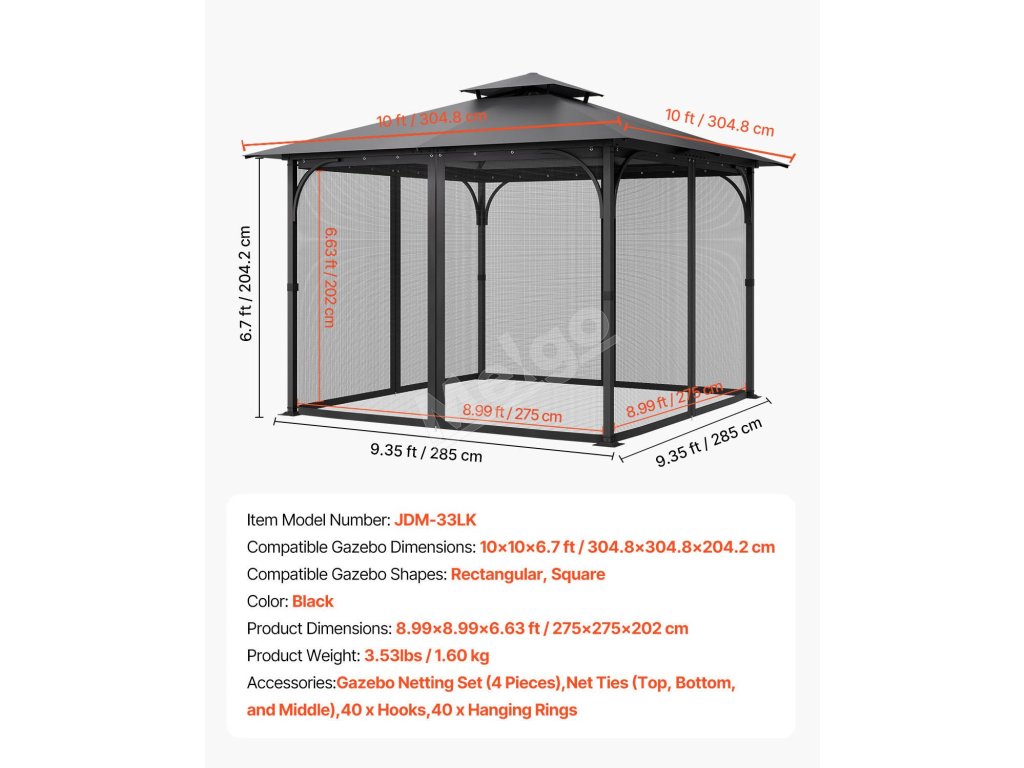 | Kompatibilné rozmery altánku | 10 × 10 × 6,7 ft / 304,8 × 304,8 × 204,2 cm |