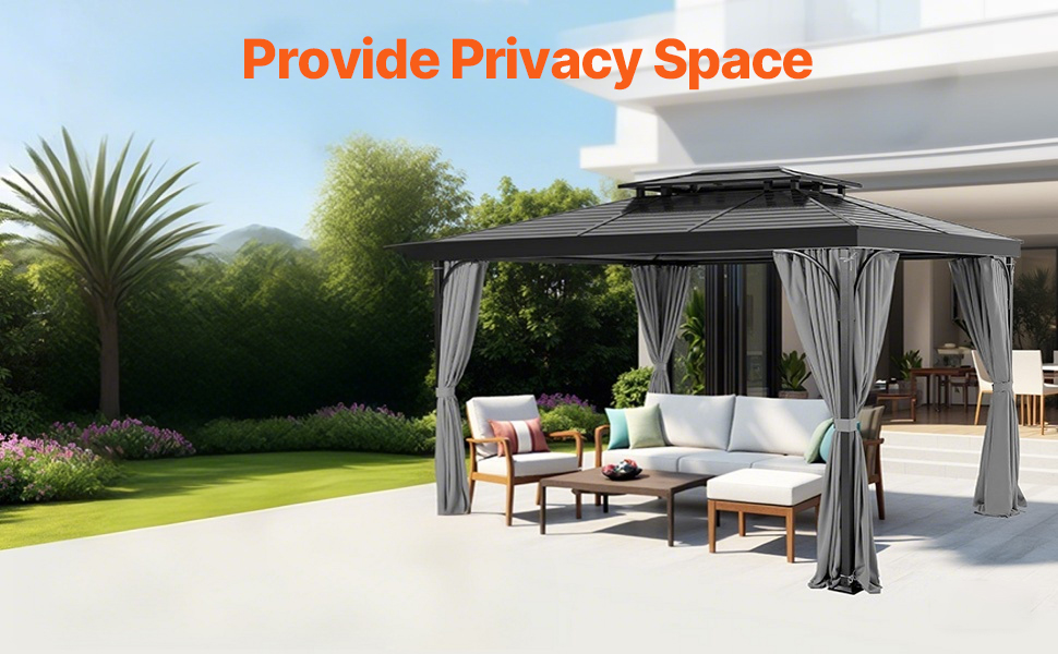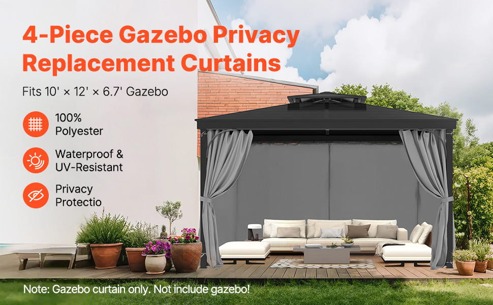 Tento odolný záves je určený pre altánky s rozmermi 10' x 12' x 6,7' a je vyrobený z nepremokavého polyesteru s gramážou 160 g/m2 na ochranu pred slnkom. Obojstranný zips umožňuje jednoduché nastavenie, zatiaľ čo hliníkové priechodky zabezpečujú rýchlu inštaláciu. Trojdielna konštrukcia s viazaním poskytuje stabilnú oporu pre vaše vonkajšie súkromie.