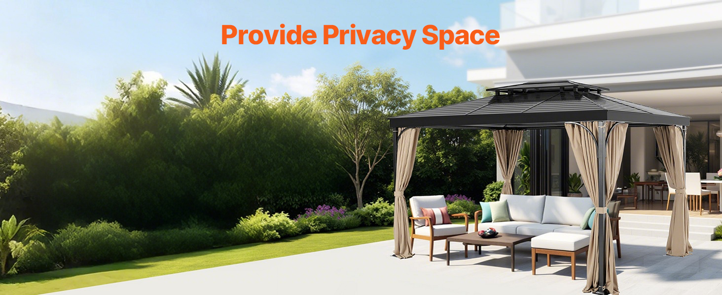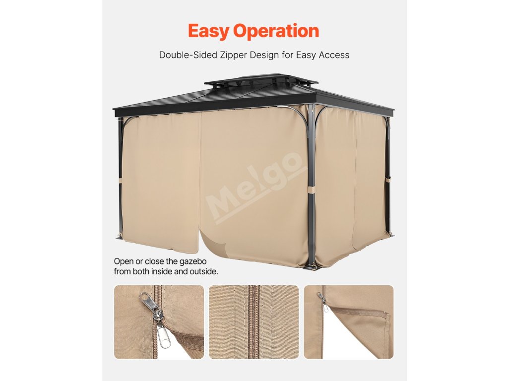 Tento záves na altánok je určený pre altánky s rozmermi 10' x 12' x 7,25' a je vyrobený z nepremokavého 100 % polyesteru s gramážou 160 g/m2, ktorý poskytuje ochranu pred slnkom. Obojstranný zips umožňuje jednoduché nastavenie, zatiaľ čo hliníkové priechodky a trojdielna väzba zabezpečujú rýchlu inštaláciu a stabilnú oporu pre optimálne súkromie.