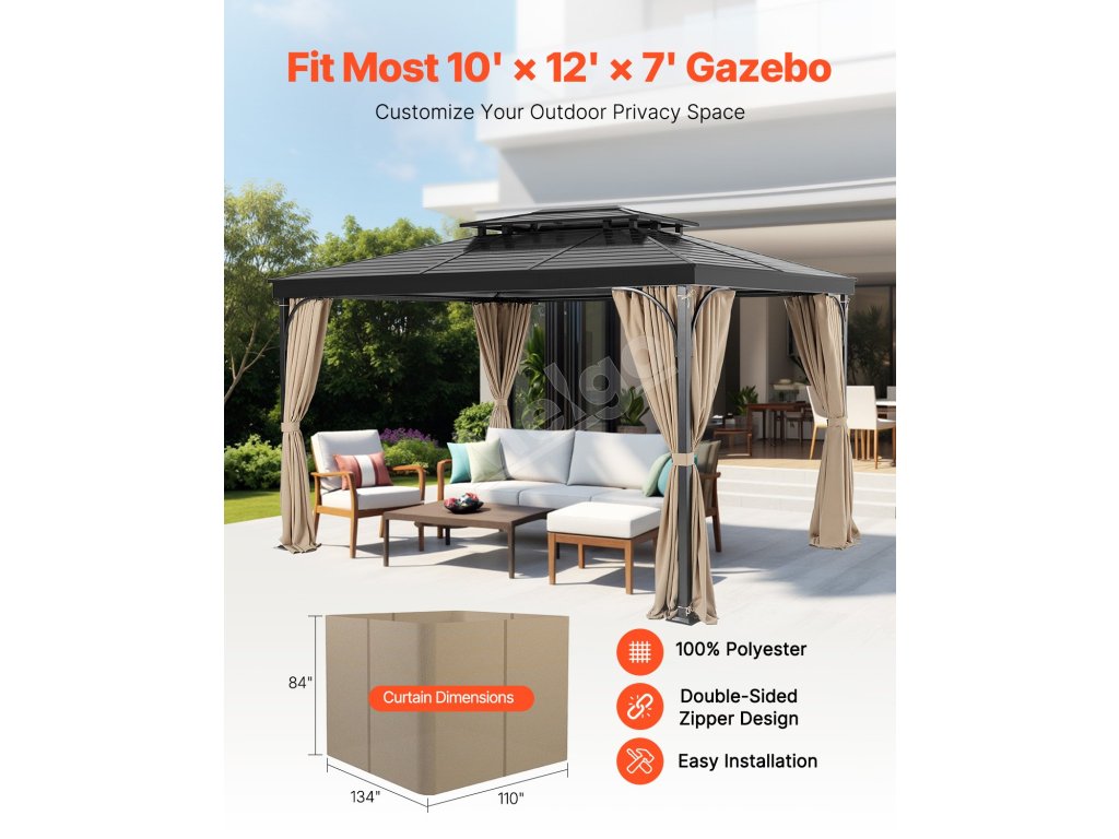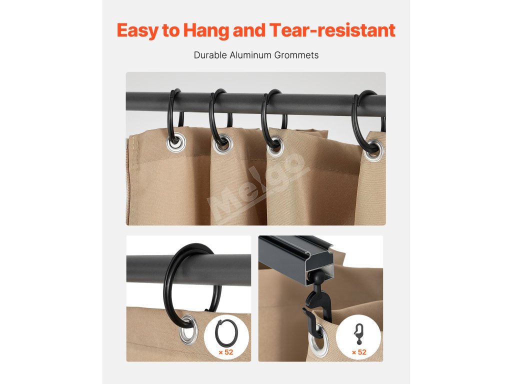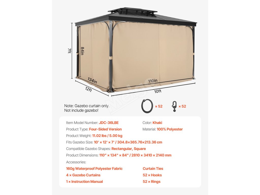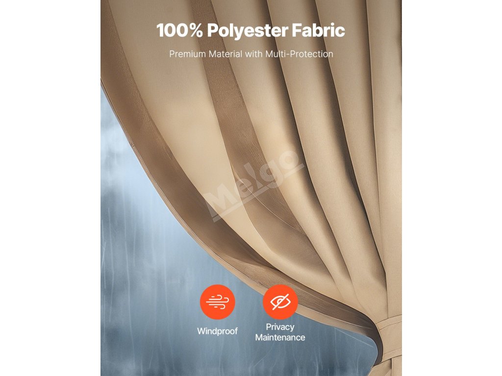 Tento záves do altánku je určený pre altánky s rozmermi 10' x 12' x 7' a je vyrobený z nepremokavého 100 % polyesteru s gramážou 160 g/m2, ktorý poskytuje ochranu pred slnkom. Obojstranný zips umožňuje jednoduché nastavenie, zatiaľ čo hliníkové priechodky a trojdielna väzba zabezpečujú rýchlu inštaláciu a stabilnú oporu pre optimálne súkromie.