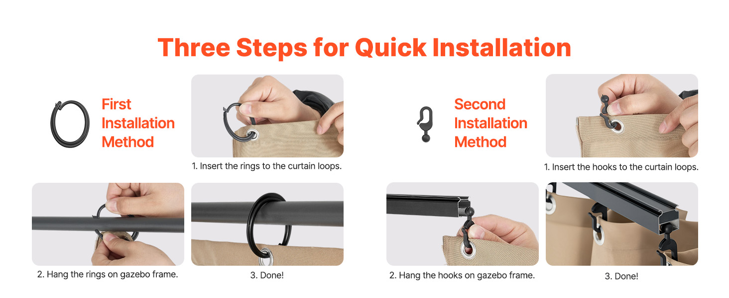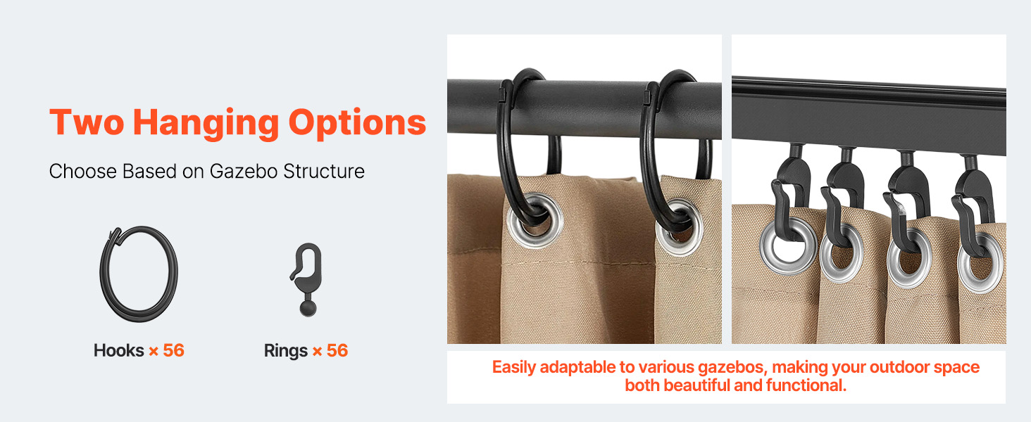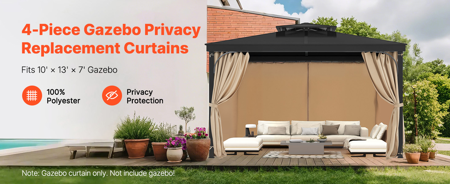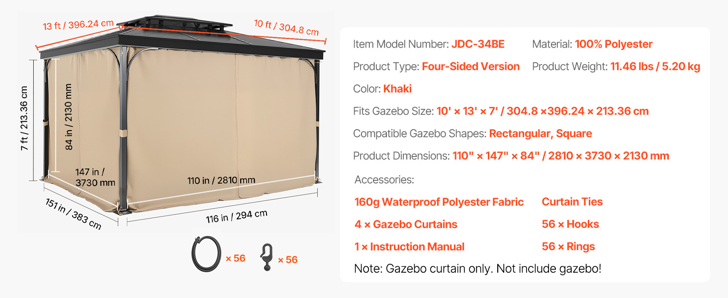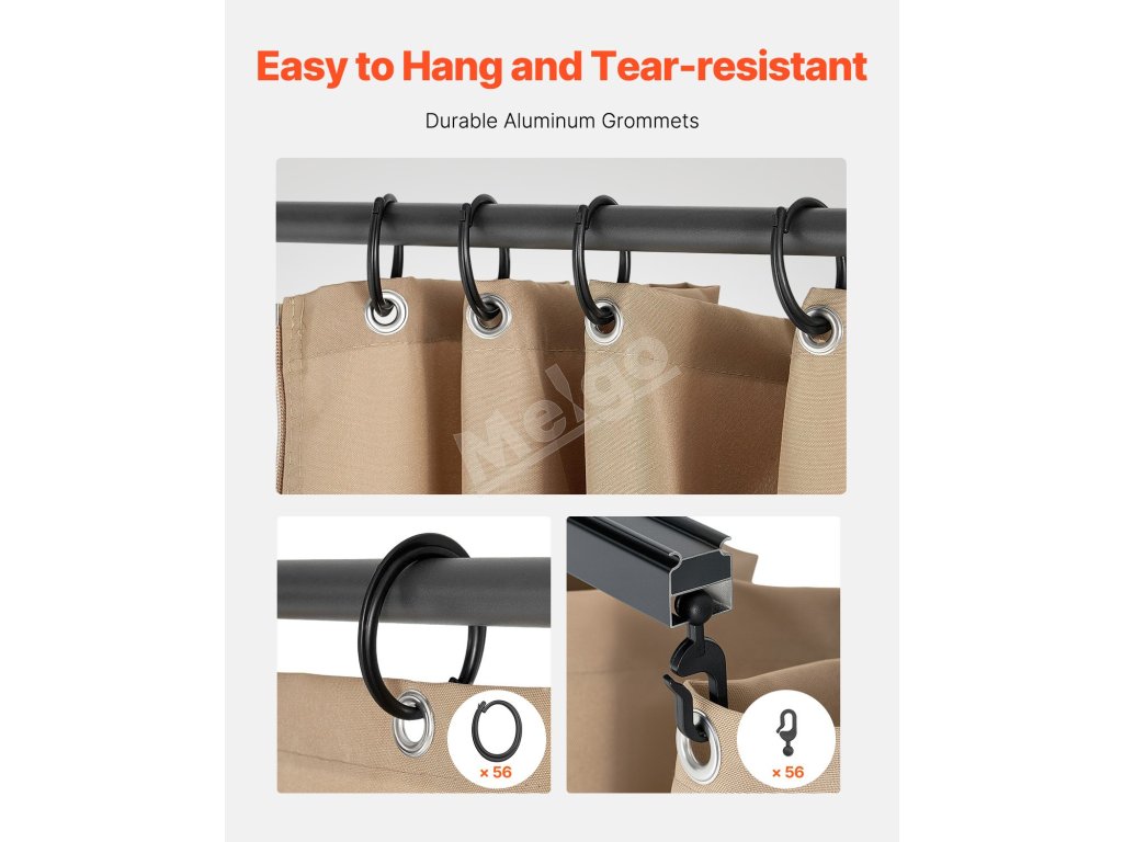 Tento záves na altánok je určený pre altánky s rozmermi 10' x 13' x 7' a je vyrobený z nepremokavého 100 % polyesteru s gramážou 160 g/m2, ktorý poskytuje ochranu pred slnkom. Obojstranný zips umožňuje jednoduché nastavenie, zatiaľ čo hliníkové priechodky a trojdielna väzba zabezpečujú rýchlu inštaláciu a stabilnú oporu pre optimálne súkromie.