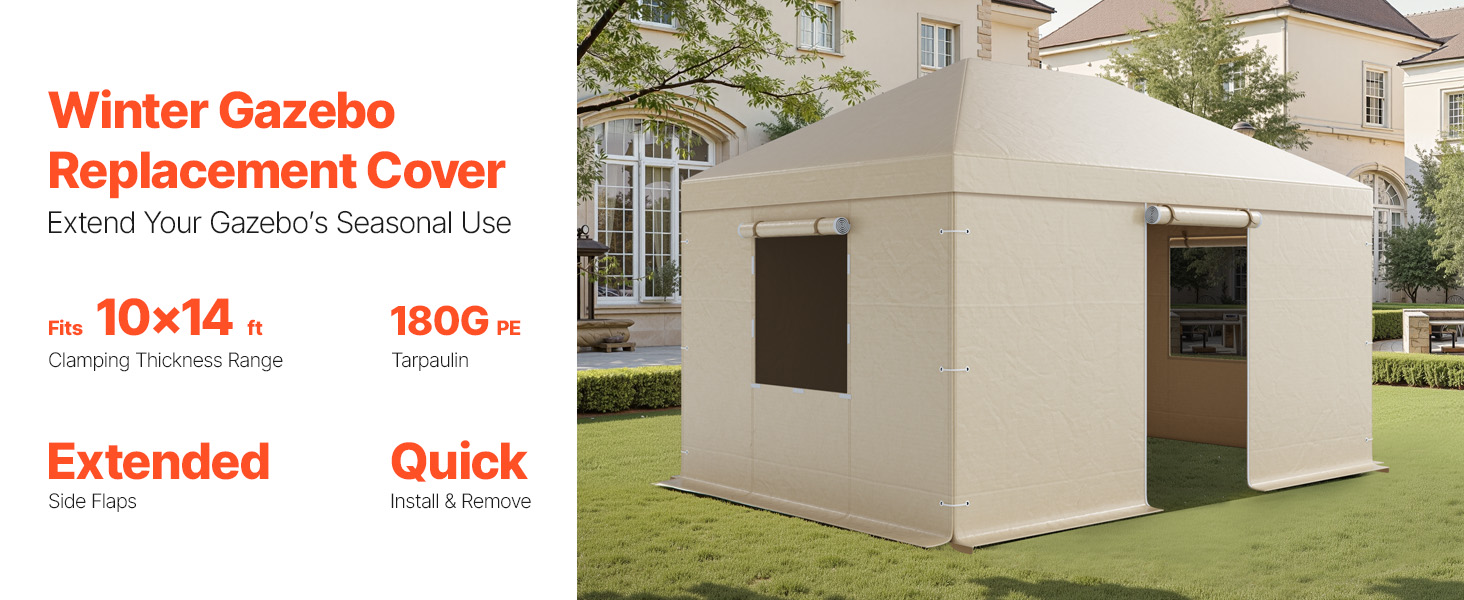 Tento náhradný zimný kryt je určený pre altánky s rozmermi 10 x 14 stôp. Plachta z PE 180G s odkvapom na zvýšenú ochranu. Dvojúčelové okná zo sieťoviny ponúkajú vetranie. Zapínanie na háčik a slučku zabezpečuje jednoduchú inštaláciu. Je ideálny na uskladnenie vozidiel, športového náradia, záhradného náradia.