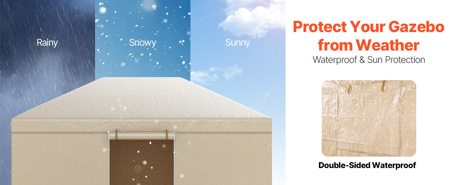 Náš kryt na vonkajší altánok s obojstrannou PE vrstvou odoláva vode, slnku a snehu. Chráni váš altánok počas slnečných, daždivých a zasnežených období bez vyblednutia alebo opotrebovania.