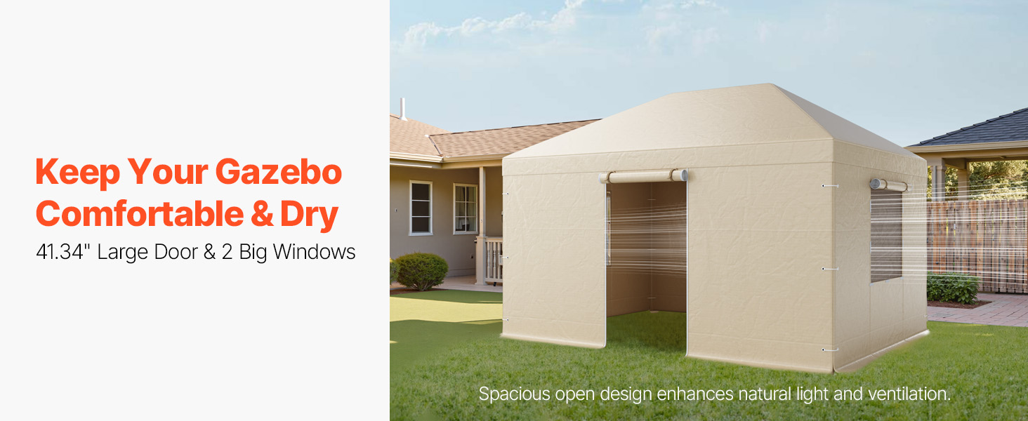 Tento univerzálny zimný kryt na altánky je vybavený 9,84 palcovou / 25 cm prízemnou lištou s kovovými priechodkami na upevnenie základne. Zosilnené viazacie popruhy sa ovíjajú okolo stĺpikov, zatiaľ čo 1,5 palcové / 3,8 cm silné háčikové a slučkové uzávery zaisťujú panely dohromady pre väčšiu odolnosť voči vetru a stabilitu.