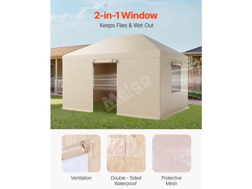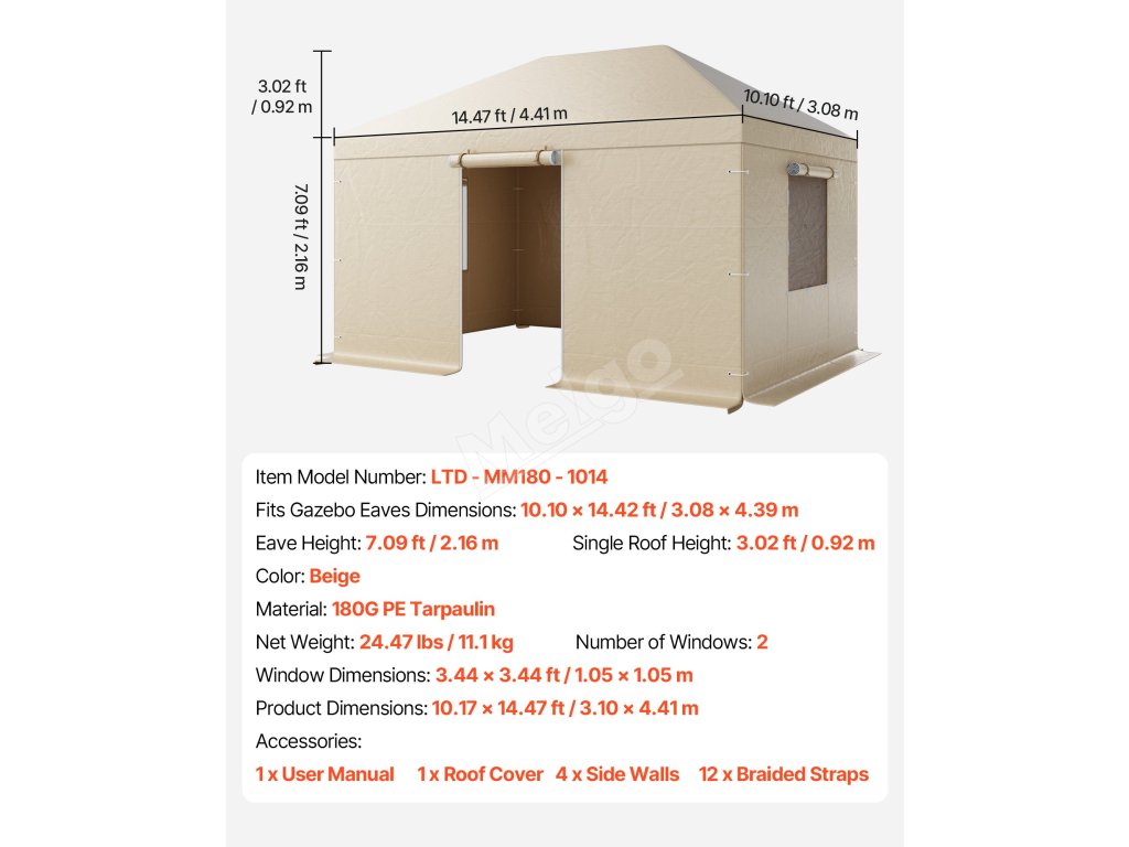 Tento náhradný zimný kryt je určený pre altánky s rozmermi 10 x 14 stôp. Plachta z PE 180G s odkvapom na zvýšenú ochranu. Dvojúčelové okná zo sieťoviny ponúkajú vetranie. Zapínanie na háčik a slučku zabezpečuje jednoduchú inštaláciu. Je ideálny na uskladnenie vozidiel, športového náradia, záhradného náradia.