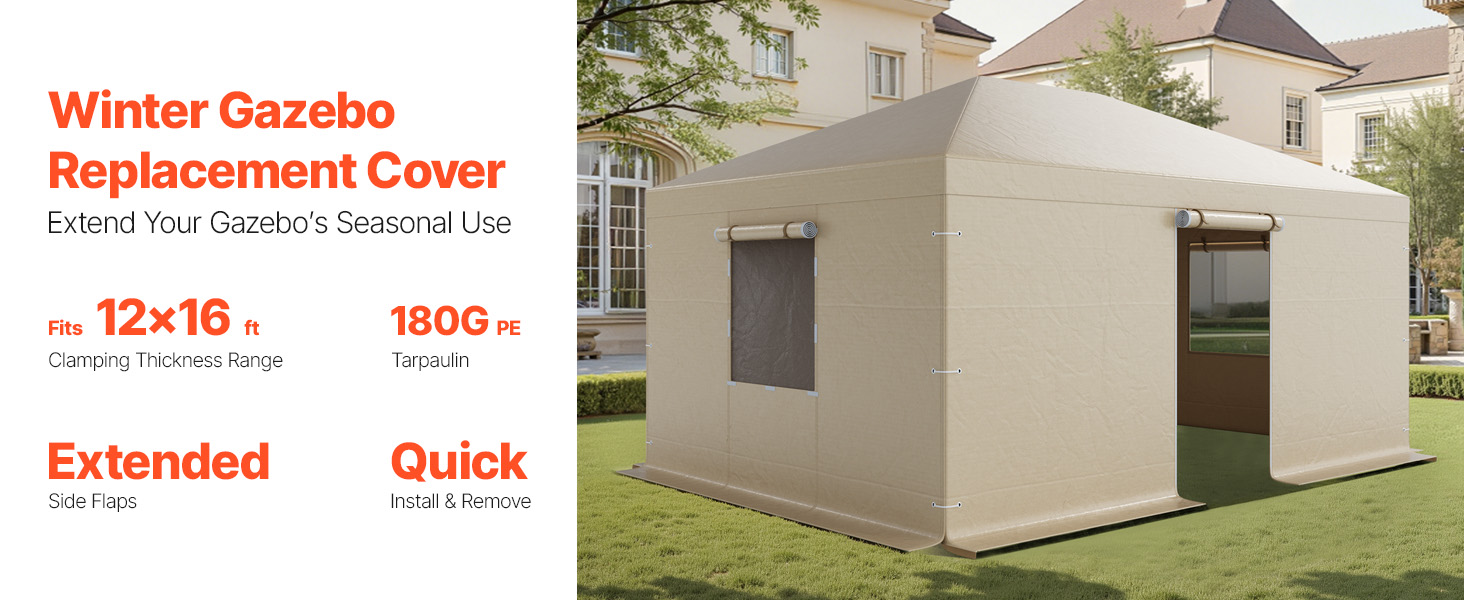 Tento zimný náhradný kryt je určený pre altánky s rozmermi 12 x 16 stôp. Plachta z PE 180G s odkvapom na zvýšenú ochranu. Dvojúčelové okná zo sieťoviny ponúkajú vetranie. Zapínanie na háčik a slučku zabezpečuje jednoduchú inštaláciu. Je ideálny na uskladnenie vozidiel, športového náradia, záhradného náradia.