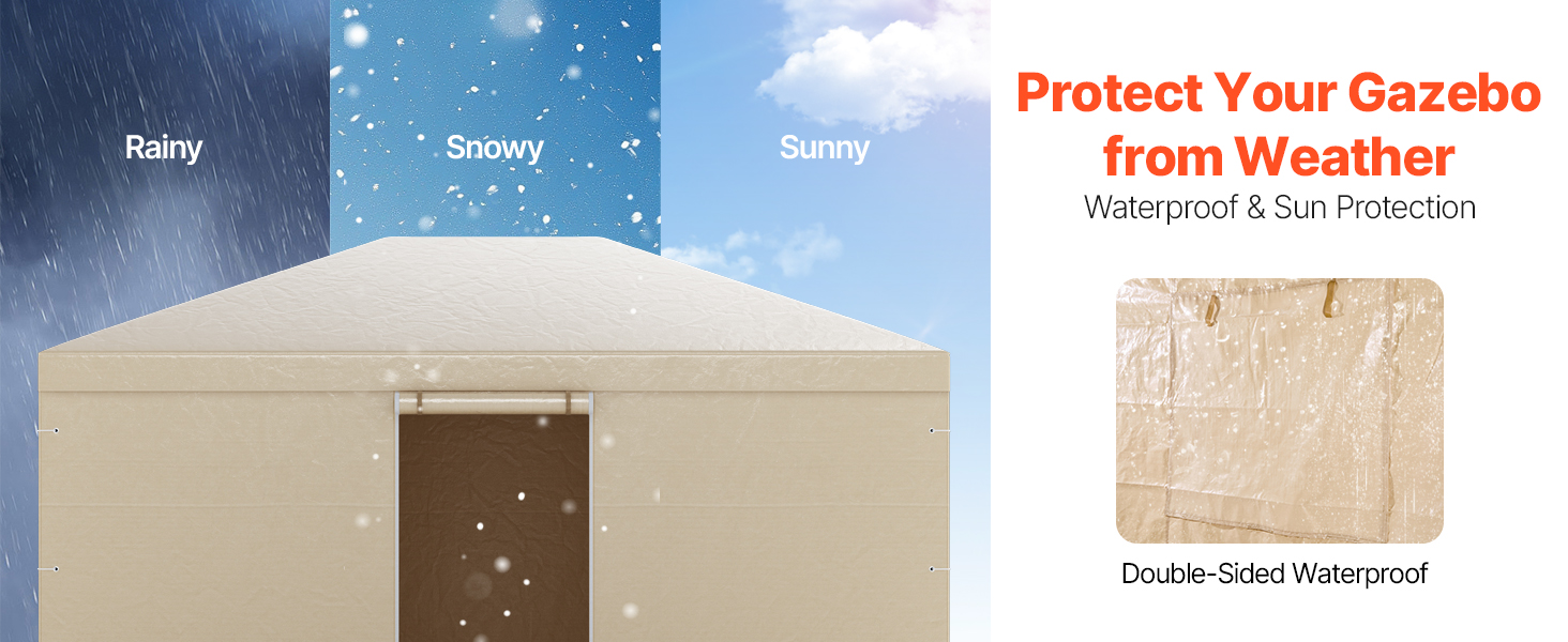 Náš kryt na vonkajší altánok s obojstrannou PE vrstvou odoláva vode, slnku a snehu. Chráni váš altánok počas slnečných, daždivých a zasnežených období bez vyblednutia alebo opotrebovania.