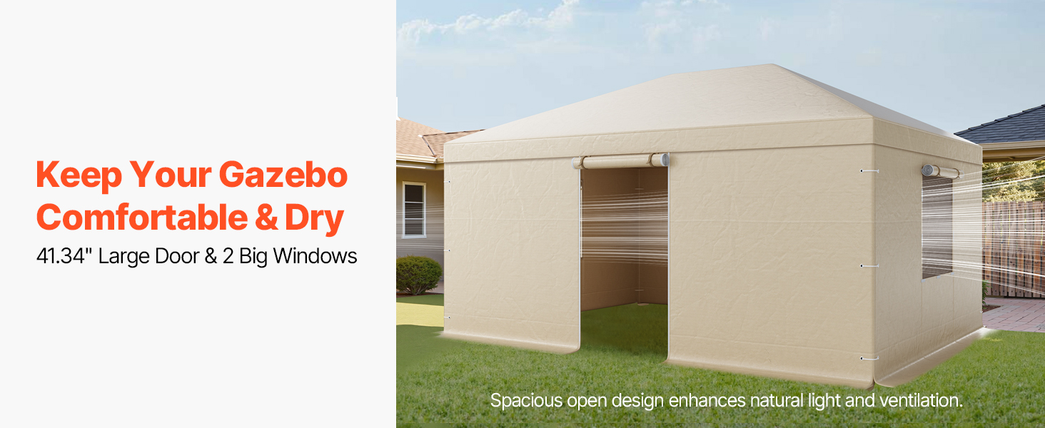 Tento univerzálny zimný kryt na altánky je vybavený 9,84 palcovou / 25 cm prízemnou lištou s kovovými priechodkami na upevnenie základne. Zosilnené viazacie popruhy sa ovíjajú okolo stĺpikov, zatiaľ čo 1,5 palcové / 3,8 cm silné háčikové a slučkové uzávery zaisťujú panely dohromady pre väčšiu odolnosť voči vetru a stabilitu.