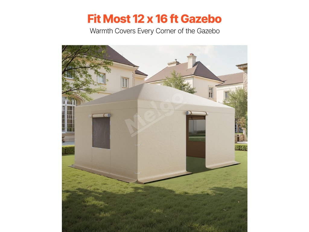 Tento univerzálny zimný kryt na altánky je vybavený 9,84 palcovou / 25 cm prízemnou lištou s kovovými priechodkami na upevnenie základne. Zosilnené viazacie popruhy sa ovíjajú okolo stĺpikov, zatiaľ čo 1,5 palcové / 3,8 cm silné háčikové a slučkové uzávery zaisťujú panely dohromady pre väčšiu odolnosť voči vetru a stabilitu.