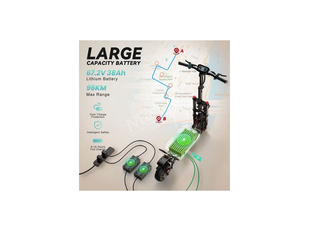 - Vybavený lítiovou batériou s ultra veľkou kapacitou 67,2 V 38 Ah a dojazdom na jedno nabitie až 90 kilometrov, ktorý sa dá ľahko zvládnuť bez ohľadu na to, či ide o mestskú dopravu alebo prieskum na dlhé vzdialenosti.