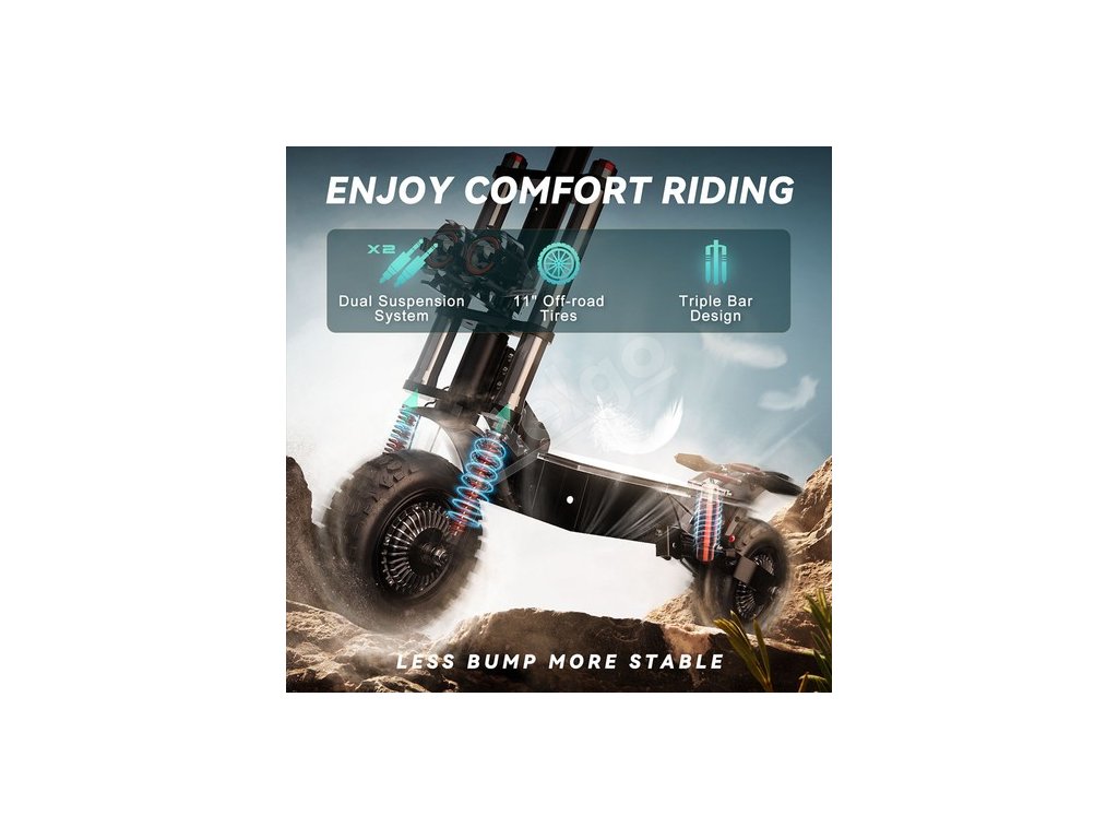 Špecifikácia | Motor: 2800W*2 Batéria: 67,2V 38Ah Pneumatiky: Brzdy: Predné a zadné hydraulické kotúčové brzdy Opruženie: Disp: Maximálne zaťaženie: 150 kg |