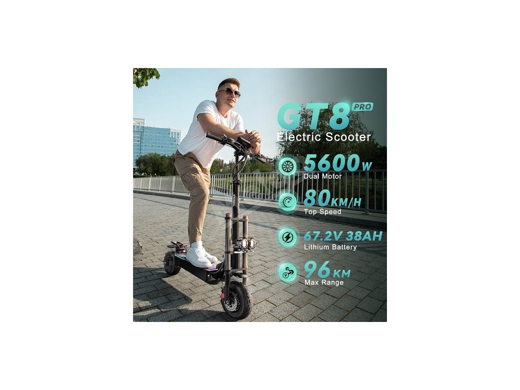- Vybavený dvoma 2800W vysokovýkonnými motormi má GT8 PRO úžasnú akceleráciu a silný stúpací výkon a ľahko zdoláva rôzne zložité podmienky na ceste.