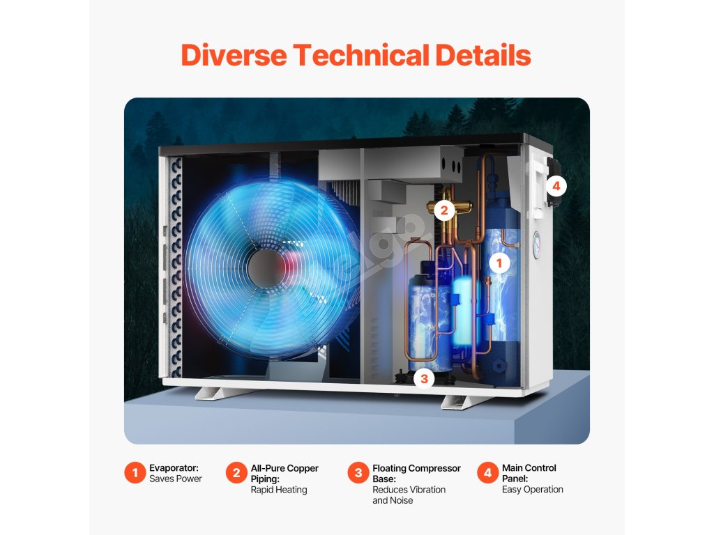 Toto bazénové tepelné čerpadlo s vysoko výkonným kompresorom na rýchly ohrev a stálu teplotu vody. Poháňané čistou energiou znižuje náklady a vplyv na životné prostredie. Používateľsky prívetivý ovládací panel a technológia redukcie hluku zabezpečujú pohodlné a tiché plávanie.