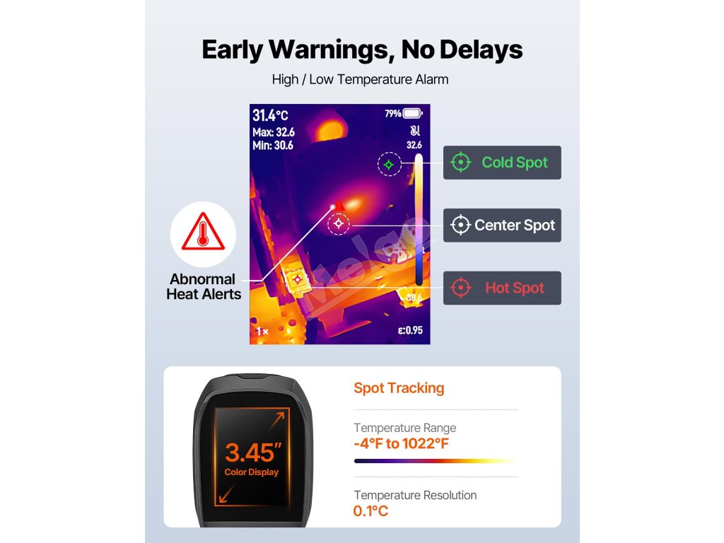 Pracujte s okamžitým zobrazovaním ako na dlani! Táto ručná termokamera rýchlo odhalí neviditeľné teplotné rozdiely, vďaka čomu sú komplexné kontroly bezproblémové.