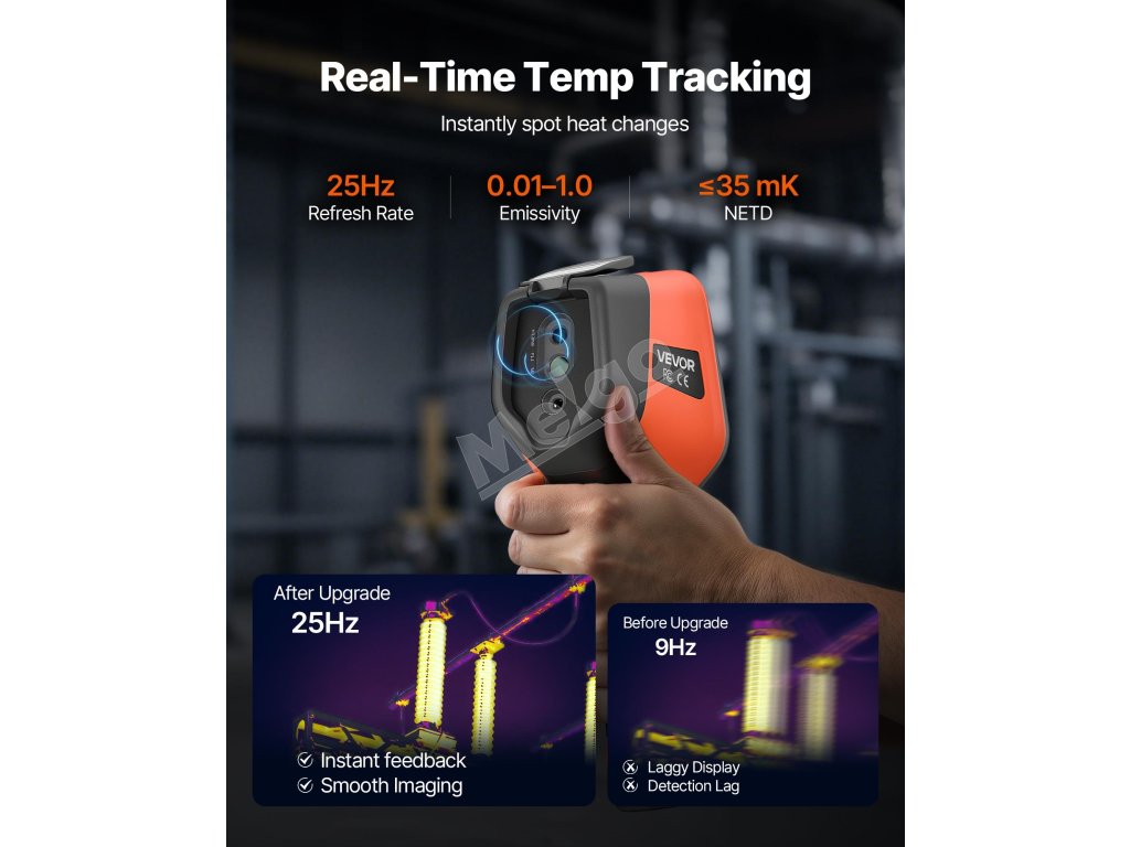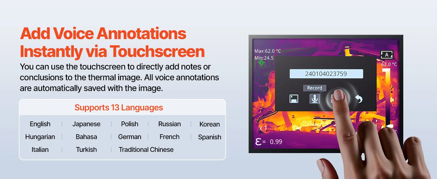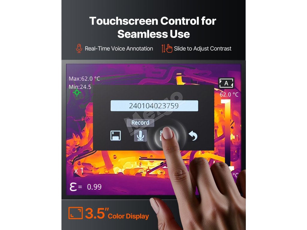 Táto termokamera je vybavená displejom s infračerveným rozlíšením 256 × 192, ktorý poskytuje jasné termálne snímky na odhalenie skrytých problémov skôr, ako sa zhoršia. Po zachytení snímky môžete priamo na 3,5-palcovom dotykovom displeji pridávať poznámky na jednoduchú dokumentáciu a organizáciu.