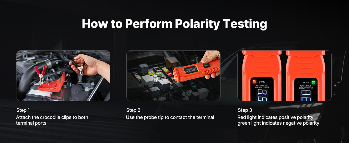 Tento skúšač elektrických obvodov podporuje testovanie polarity neistých kontaktov obvodov vo vozidlách v 3 jednoduchých a rýchlych krokoch. Ovládanie je pomerne jednoduché.