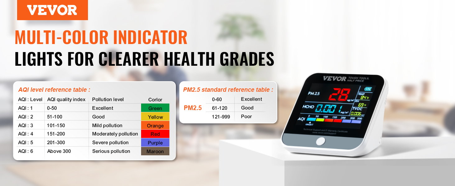 Displej je vybavený viacfarebnými indikátormi, ktorých farba sa mení podľa úrovne znečistenia ovzdušia, takže je prehľadný a intuitívny.