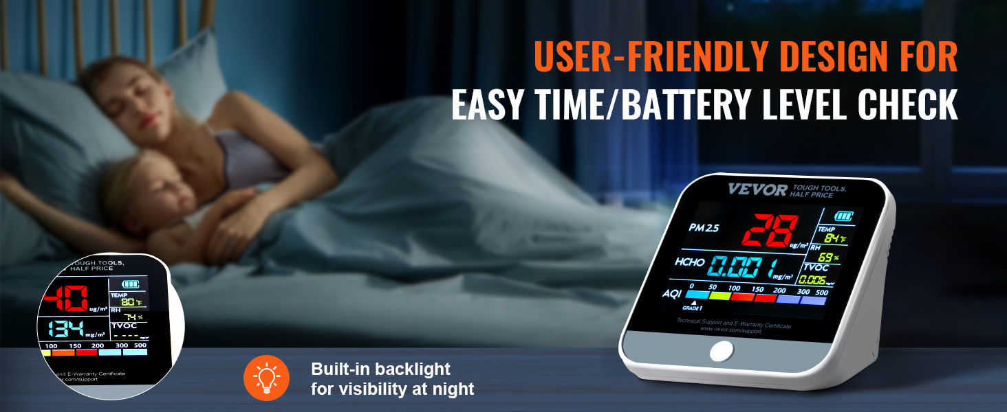 Náš detektor kvality vzduchu zobrazuje všetky údaje na celej obrazovke spolu s časom a úrovňou nabitia batérie. Konštrukcia s podsvietením zaručuje prehľadnosť aj v noci.