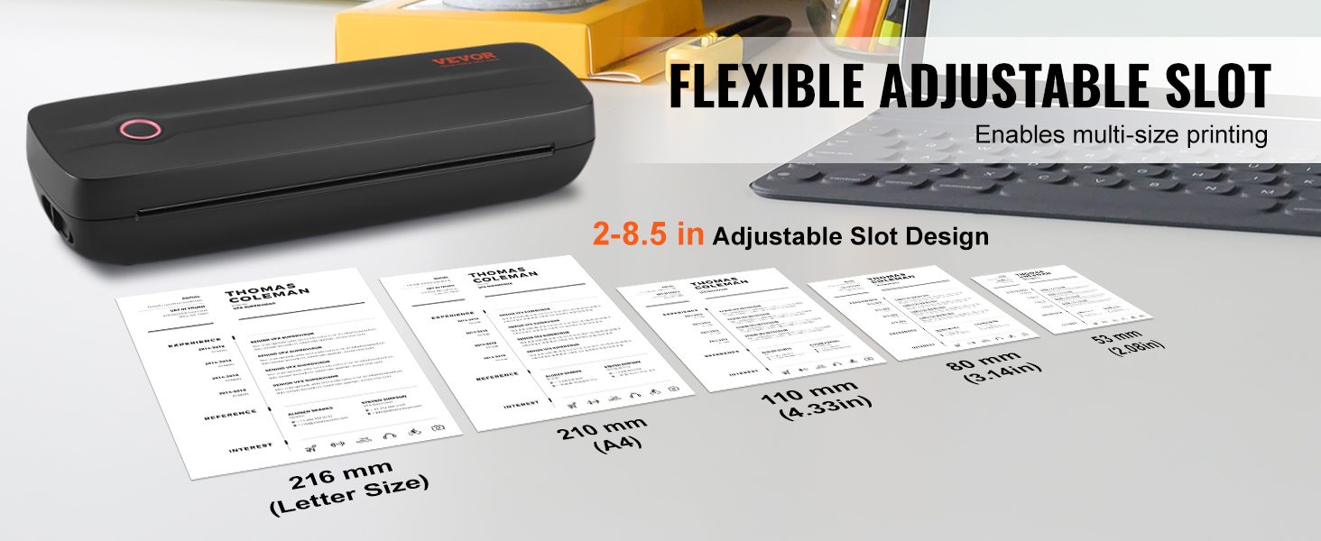 Štrbinu ľahko nastavíte tak, aby ste mohli tlačiť na papier s veľkosťou od 2 do 8,5 palca. Táto prenosná bezdrôtová tlačiareň spĺňa všetky vaše tlačové potreby, takže je skvelým doplnkom vášho pracovného priestoru.