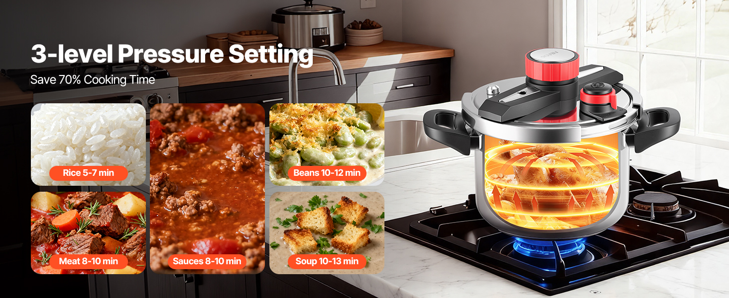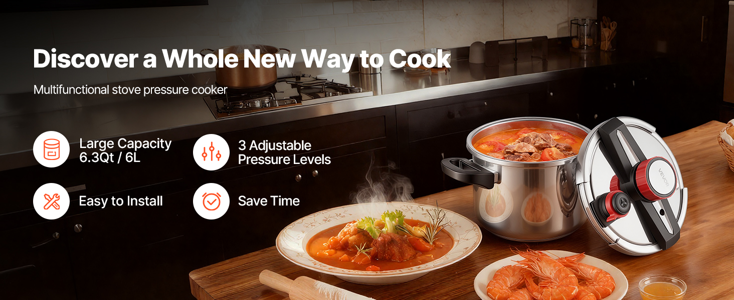 Tlakový hrniec VEVOR prináša rýchlosť, farbu a hlbokú chuť do vašej kuchyne tým, že rýchlo uzamkne prirodzenú chuť. Vyniká pri príprave vývarov, jemných rýb a výdatných dusených jedál, čím vám poskytuje nástroj, ktorý udržuje čas strávený pri jedle efektívny, príjemný a ľahko zvládnuteľný každý deň.