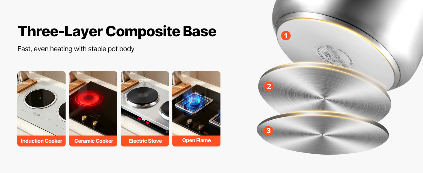 Tlakový hrniec s trojvrstvovým dnom zabezpečuje rýchle a rovnomerné zahrievanie, ktoré pomáha obmedziť pripálenie počas používania. Je kompatibilný s indukčnými, keramickými, elektrickými a plynovými varnými doskami, čím vám poskytuje flexibilné možnosti varenia a zároveň pomáha znížiť spotrebu energie a čas strávený v kuchyni.