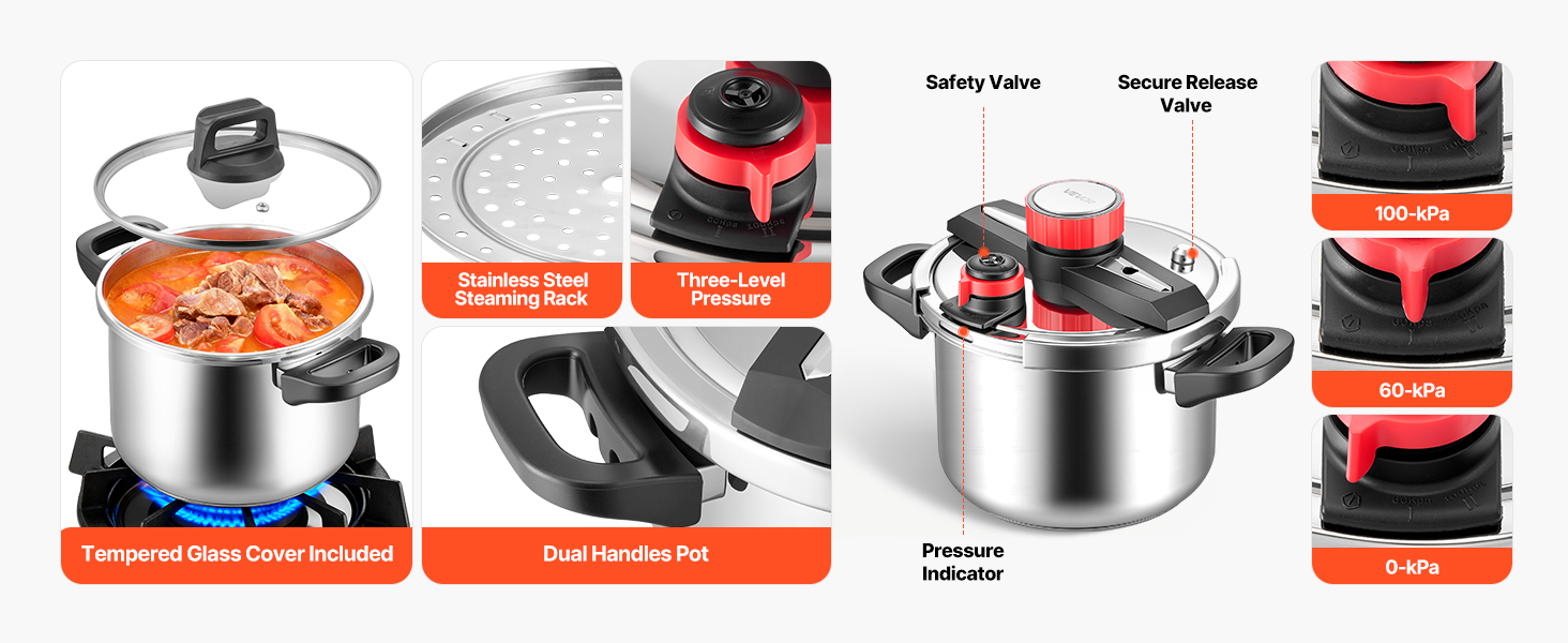 Tlakový hrniec je vyrobený z nehrdzavejúcej ocele a má zrkadlový povrch, ktorý pomáha ľahko opláchnuť zvyšky jedla. Jeho gombík na uzamknutie umožňuje hladké otváranie jednou rukou a postupná uzamykateľná konštrukcia s mäkkou ergonomickou rukoväťou ponúka stabilné a pohodlné ovládanie pri každodennom varení.