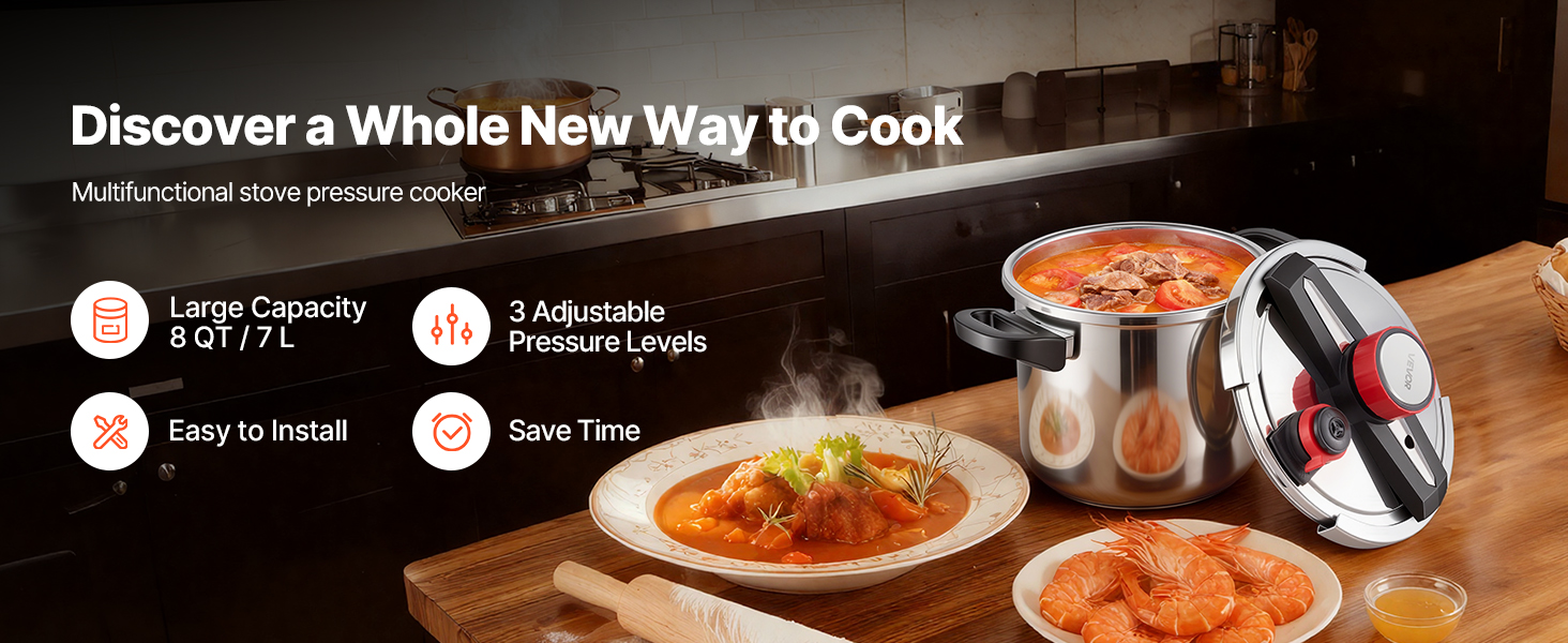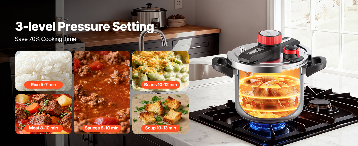 Tlakový hrniec VEVOR prináša rýchlosť, farbu a hlbokú chuť do vášho varenia tým, že rýchlo uzavrie prirodzenú chuť. Vyniká pri vývaroch, jemných rybách a výdatných dusených jedlách, čím vám poskytuje nástroj, ktorý udržuje čas jedla efektívny, príjemný a ľahko zvládnuteľný každý deň.